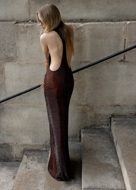 Burgundy Rhinestone Long Sleeve Maxi Dress