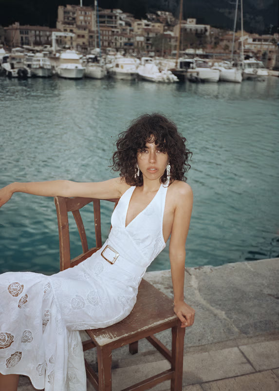 Champagne Rhinestone Ruffle Draped Maxi Dress