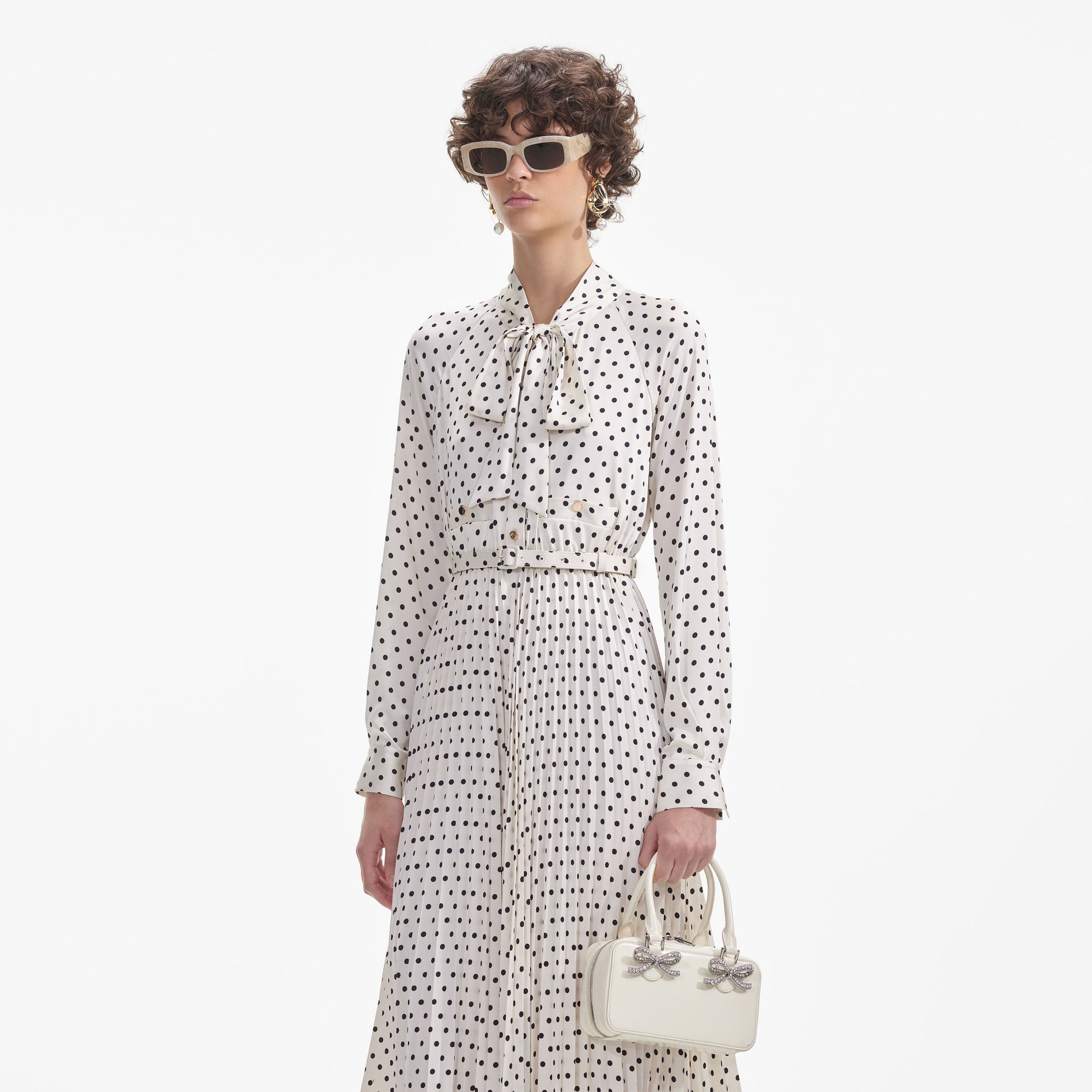 Effortlessly ladylike in polka dot satin, this year-round midi — with its pussy bow neckline and full skirt — is swathed in retro charm. Accentuate the look with our statement gold jewellery.