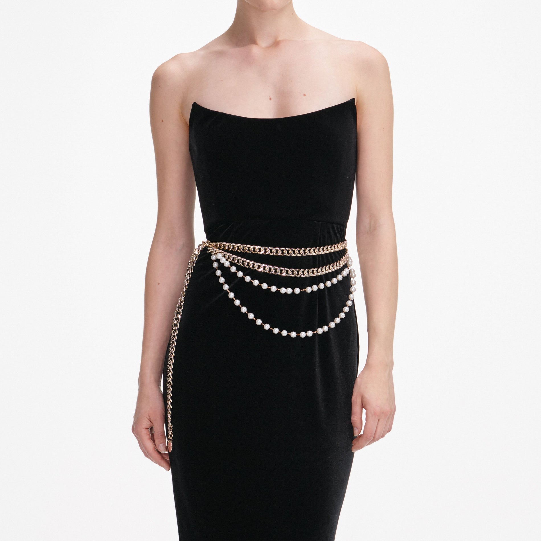 A bold side cut-out dials up the drama on this black velvet midi dress. Accented with diamanté embellished gold chains for contemporary shine – style with heels to channel your inner femme fatale.